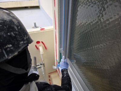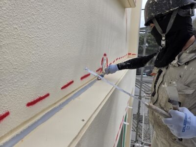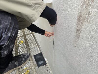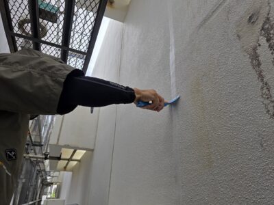 ひび割れカット・プライマー塗布後、メッシュ補強